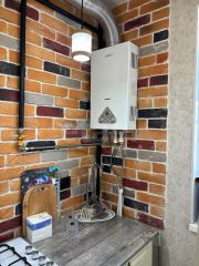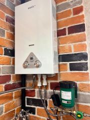 Установлен газовый водонагреватель, гарантирующий бесперебойное горячее водоснабжение в любое время года.