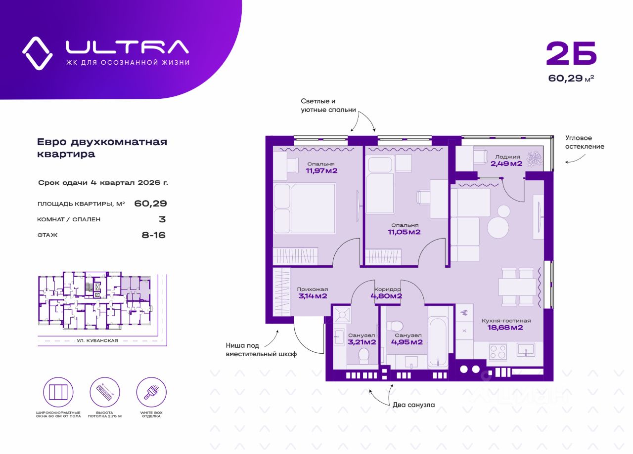 ULTRA — ЖИЛОЙ КОМПЛЕКС ДЛЯ ОСОЗНАННОЙ ЖИЗНИ Объект расположен в Советском районе города Астрахань по адресу: ул. Кубанская, 74, в 10 минутах от делового центра. Дата ввода в эксплуатацию первой очереди: IV кв. 2026 года. Но уже сейчас вы можете проследить за качеством строительства на экскурсии или в офисе продаж, где наши менеджеры ответят на все ваши вопросы. Кратко о ЖК в цифрах: - 2 дома - 1 закрытый двор - 19 этажей - 70% фасада — стекло - 10 коммерческих помещения - 3х метровые потолки в пентхаусах - 162 квартиры в 1 доме Одним из ключевых преимуществ нашего жилого комплекса является развитая инфраструктура, где все необходимое находится в пределах 15-ти минутной прогулки: • Супермаркеты в минуте ходьбы от вашего подъезда • Гипермаркет Лента в 5 минутах на машине • Учебные заведения: детские сады, школы, 2 гимназии, мед.колледж и уневрситет • Спортивный комплекс в шаговой доступности • Развлекательный центр Волга-Сити • Транспротная развязка, с которой вы можете попасть в любую точку Астрахани. В домах эргономичные планировки, в которых место найдется каждому: 1-2-3х комнатные квартиры, площадью — от 27,8 м² до 72,8 м². А соседей вы даже не заметите — в домах продумана улучшенная шумоизоляция. В строительстве используются тщательно подобранные материалы, поверхности и технологии с максимальным звукоподавлением. В жилом комплексе ULTRA мы предлагаем несколько тщательно проработанных вариантов отделки, которые удовлетворят самые разные вкусы и предпочтения наших жителей: предчистовая отделка или дизайнерский ремонт разных оттенков от застройщика. Закрытый двор без машин полностью с безбарьерной средой и территорией в пол гектара. Ландшафтные архитекторы объединили уютный двор, общественные зоны и площадку перед домом в единое безопасное пространство: - Площадки и игровые комплексы для разных возрастов - Work-out и площадка с теннисными столами - Площадка для тренировки единоборств - Зоны для дрессировки питомцев - Тихие и уютные места для отдыха и работы на свежем воздухе. Изюминка комплекса — пентхаусы на последних трех этажах, с потолками высотой 3 метра. Несколько мастер-спален с отдельными ванными и местами для хранения. Впечатляющие панорамы из всех окон. Удобное разделение квартиры на приватную и дневную зоны. И большие террасы, на которых можно организовать дополнительную рабочую зону или зону для отдыха. Нам небезралична судьба наших жилых кварталов после завершения строительтсва. Мы хотим, чтобы они долгие-долгие годы оставались современными, уютными и ухоженными. Именно поэтому после ввода в эксплуатацию ЖК ULTRA управление будет передано проверенной и надежной управляющей компании, которая обеспечит качественное обслуживание и комфортные условия для жителей.