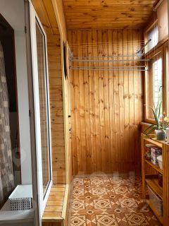 материал окон: в кухне, гостиной и на малой лоджии ПВХ, на большой лоджии дерево.
