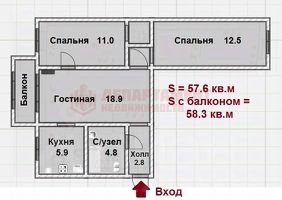 Центр квартиры - гостиная 18,9 кв.м. Из неё выход на балкон, Балкон закрыт сайдингом не полностью. Оставлен проём на улицу. Из зала также кухня, спальня 11 кв.м (со стенным шкафом), спальня 12,5 кв.м. Т.е. СПАЛЬНИ НОРМАЛЬНОГО РАЗМЕРА, не капелюшечные.