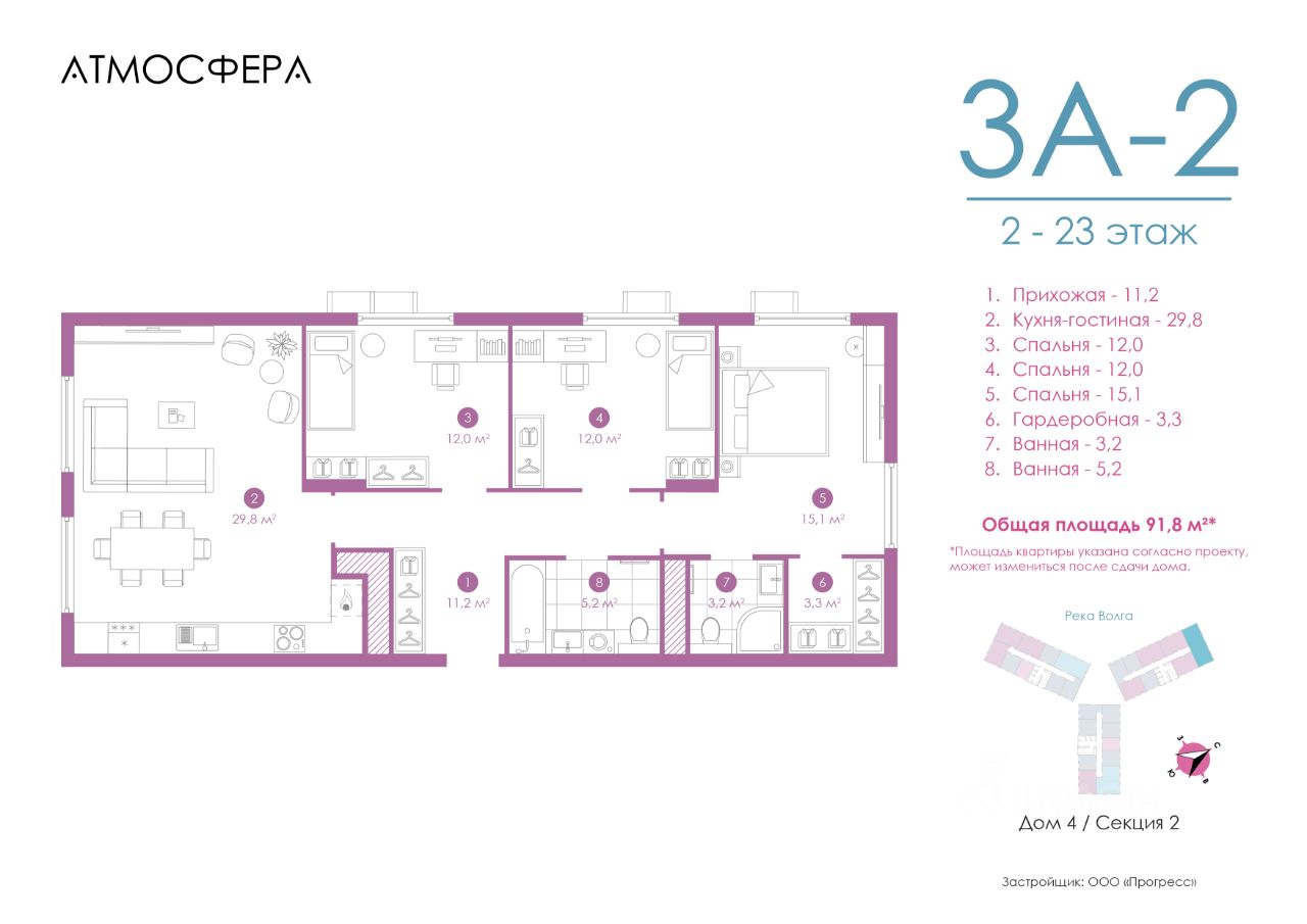 Продажа от застройщика PROGRESS — дерзкий девелопер федерального уровня, одна из самых быстроразвивающихся компаний на российском рынке. Предвосхищает ваши ожидания с 2012 года. Каждый проект PROGRESS оригинален, отличается дизайном, архитектурой и ландшафтными решениями. Является обладателем Золотого знака "Надёжный застройщик России — 20202023". Комплекс обслуживает собственная сервисная компания "Среда". Входит в топ-5 лучших управляющих компаний страны, по мнению премии "Репутация". Живи в Атмосфере Жилой комплекс "Атмосфера" — уникальный проект линейки PRO MAX. Многоуровневая закрытая дворовая территория, авторская концепция холлов, сервис на уровне пятизвёздочного отеля. Уединённая локация между двумя водными пространствами — рекой Волгой и Приволжским затоном. На безопасной приватной дворовой территории ведётся круглосуточное видеонаблюдение. Для самых маленьких здесь оборудован детский игровой центр — кидс клаб, а для взрослых — премиальная кофейня с чарующим видом на Волгу. "Атмосфера" выводит понятие "комфорт" на совершенно иной уровень. Каждая деталь говорит о стремлении к совершенству. "Атмосфера" в цифрах: 4 дома с собственной уникальной и интерактивной дворовой территорией прямо на берегу реки Волги 1 приватный двор размером с городской парк 7 спортивных площадок 6 пространств для отдыха 5 детских площадок, включающих в себя интерактивный ручеёк и автодром 10 минут от исторической части города Почувствуй роскошный сервис • Собственная сервисная компания "Среда" поможет не беспокоиться о бытовых проблемах. • Персональное мобильное приложение "Среда", в котором можно просматривать новости и объявления, оплачивать коммунальные счета, получить доступ во двор и к камерам видеонаблюдения. • Консьерж-сервис. • Бесплатный wi-fi на всей территории комплекса. Квартира с предчистовой отделкой включает в себя: — Межквартирные стены, выровненные по маякам. — Межкомнатные стены из гипсовых пазогребневых плит, не требующие дополнительного выравнивания. — Откосы входной двери и оконных проёмов, реализованные и подготовленные к финишной отделке. — Напольное покрытие без стяжки. — Электрическая проводка по потолку. — Подводка инженерных коммуникаций к местам установки сантехнических приборов. Способы приобретения квартиры: С помощью материнского капитала В ипотеку Забронируйте квартиру по номеру телефона офиса продаж. Выведи свою жизнь на новый уровень. Живи в Атмосфере.
