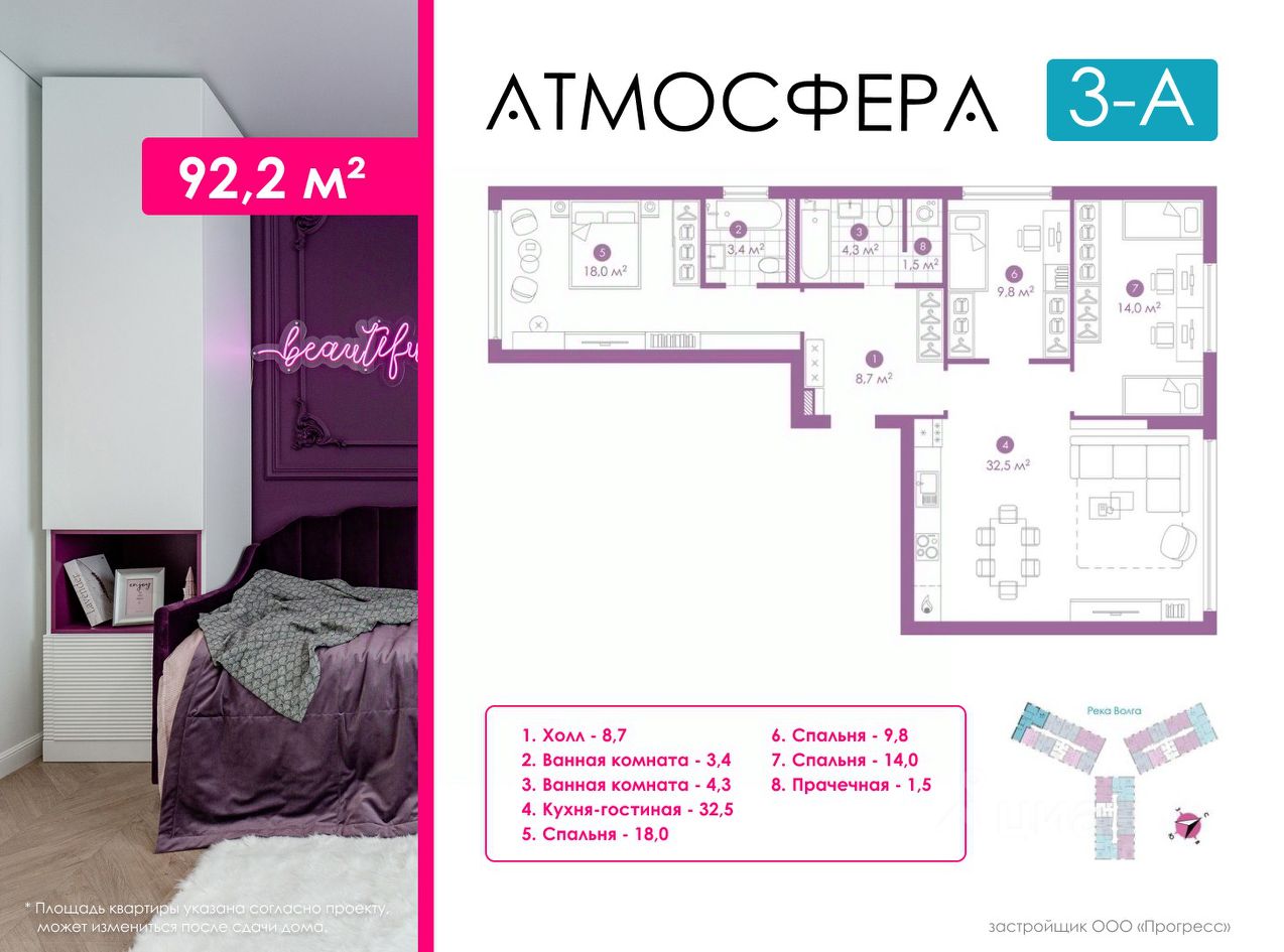 Продажа от застройщика PROGRESS — дерзкий девелопер федерального уровня, одна из самых быстроразвивающихся компаний на российском рынке. Предвосхищает ваши ожидания с 2012 года. Каждый проект PROGRESS оригинален, отличается дизайном, архитектурой и ландшафтными решениями. Является обладателем Золотого знака "Надёжный застройщик России — 20202023". Комплекс обслуживает собственная сервисная компания "Среда". Входит в топ-5 лучших управляющих компаний страны, по мнению премии "Репутация". Живи в Атмосфере Жилой комплекс "Атмосфера" — уникальный проект линейки PRO MAX. Многоуровневая закрытая дворовая территория, авторская концепция холлов, сервис на уровне пятизвёздочного отеля. Уединённая локация между двумя водными пространствами — рекой Волгой и Приволжским затоном. На безопасной приватной дворовой территории ведётся круглосуточное видеонаблюдение. Для самых маленьких здесь оборудован детский игровой центр — кидс клаб, а для взрослых — премиальная кофейня с чарующим видом на Волгу. "Атмосфера" выводит понятие "комфорт" на совершенно иной уровень. Каждая деталь говорит о стремлении к совершенству. "Атмосфера" в цифрах: 4 дома с собственной уникальной и интерактивной дворовой территорией прямо на берегу реки Волги 1 приватный двор размером с городской парк 7 спортивных площадок 6 пространств для отдыха 5 детских площадок, включающих в себя интерактивный ручеёк и автодром 10 минут от исторической части города Почувствуй роскошный сервис • Собственная сервисная компания "Среда" поможет не беспокоиться о бытовых проблемах. • Персональное мобильное приложение "Среда", в котором можно просматривать новости и объявления, оплачивать коммунальные счета, получить доступ во двор и к камерам видеонаблюдения. • Консьерж-сервис. • Бесплатный wi-fi на всей территории комплекса. Квартира с предчистовой отделкой включает в себя: — Межквартирные стены, выровненные по маякам. — Межкомнатные стены из гипсовых пазогребневых плит, не требующие дополнительного выравнивания. — Откосы входной двери и оконных проёмов, реализованные и подготовленные к финишной отделке. — Напольное покрытие без стяжки. — Электрическая проводка по потолку. — Подводка инженерных коммуникаций к местам установки сантехнических приборов. Способы приобретения квартиры: С помощью материнского капитала В ипотеку Забронируйте квартиру по номеру телефона офиса продаж. Выведи свою жизнь на новый уровень. Живи в Атмосфере.