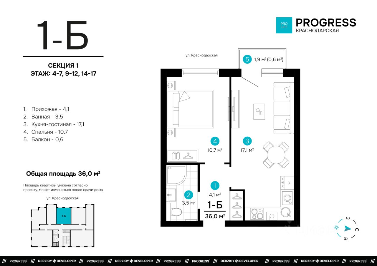 Продаётся 1-комнатная квартира в строящемся доме (Дом 1), срок сдачи: I-кв. 2028, общей площадью 35.96 кв.м., на 4 этаже. Новый жилой комплекс "Точка" от застройщика "Будущее" расположен по адресу: г. Астрахань, ул. Краснодарской, 43а