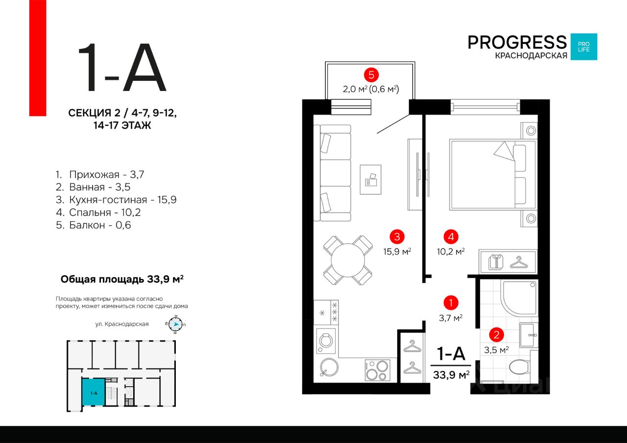 Продаётся 1-комнатная квартира в строящемся доме (Дом 1), срок сдачи: I-кв. 2028, общей площадью 33.92 кв.м., на 5 этаже. Новый жилой комплекс "Точка" от застройщика "Будущее" расположен по адресу: г. Астрахань, ул. Краснодарской, 43а