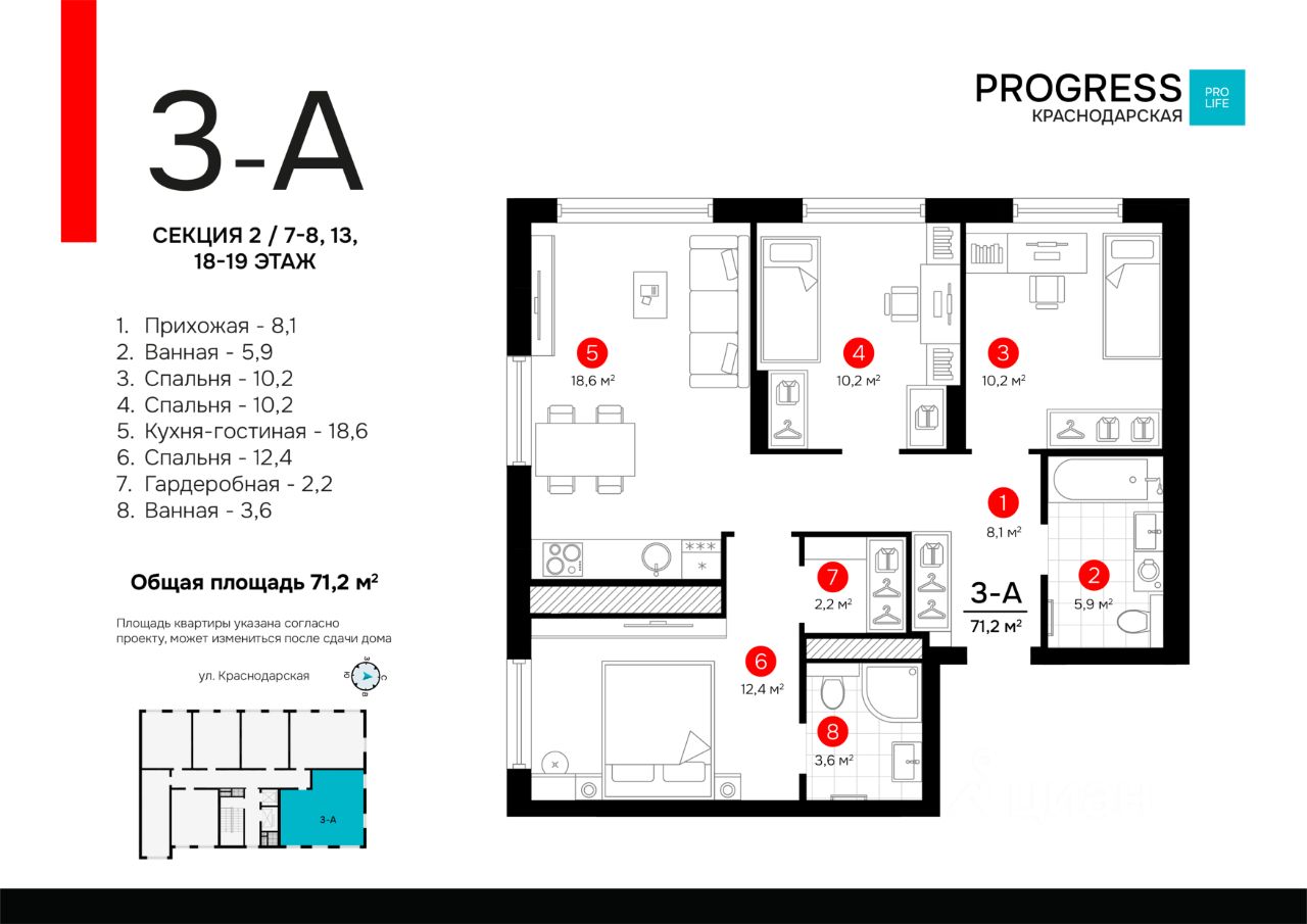 Продаётся 3-комнатная квартира в строящемся доме (Дом 1), срок сдачи: I-кв. 2028, общей площадью 71.24 кв.м., на 8 этаже. Новый жилой комплекс "Точка" от застройщика "Будущее" расположен по адресу: г. Астрахань, ул. Краснодарской, 43а