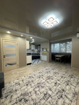 Просторная гостиная объединена с кухней в едином пространстве, что позволяет создать атмосферу общения и уюта. Здесь установлен удобный диван, полки и телевизор. Большие окна наполняют комнату естественным светом.