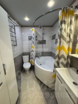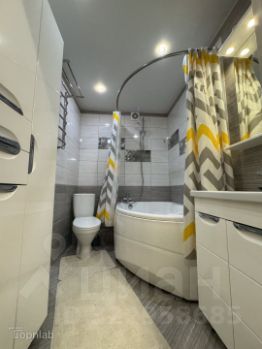 Современный санузел с качественной сантехникой и плиткой. В нем установлена ванна, умывальник с зеркалом и вместительным шкафом для хранения ванных принадлежностей .
