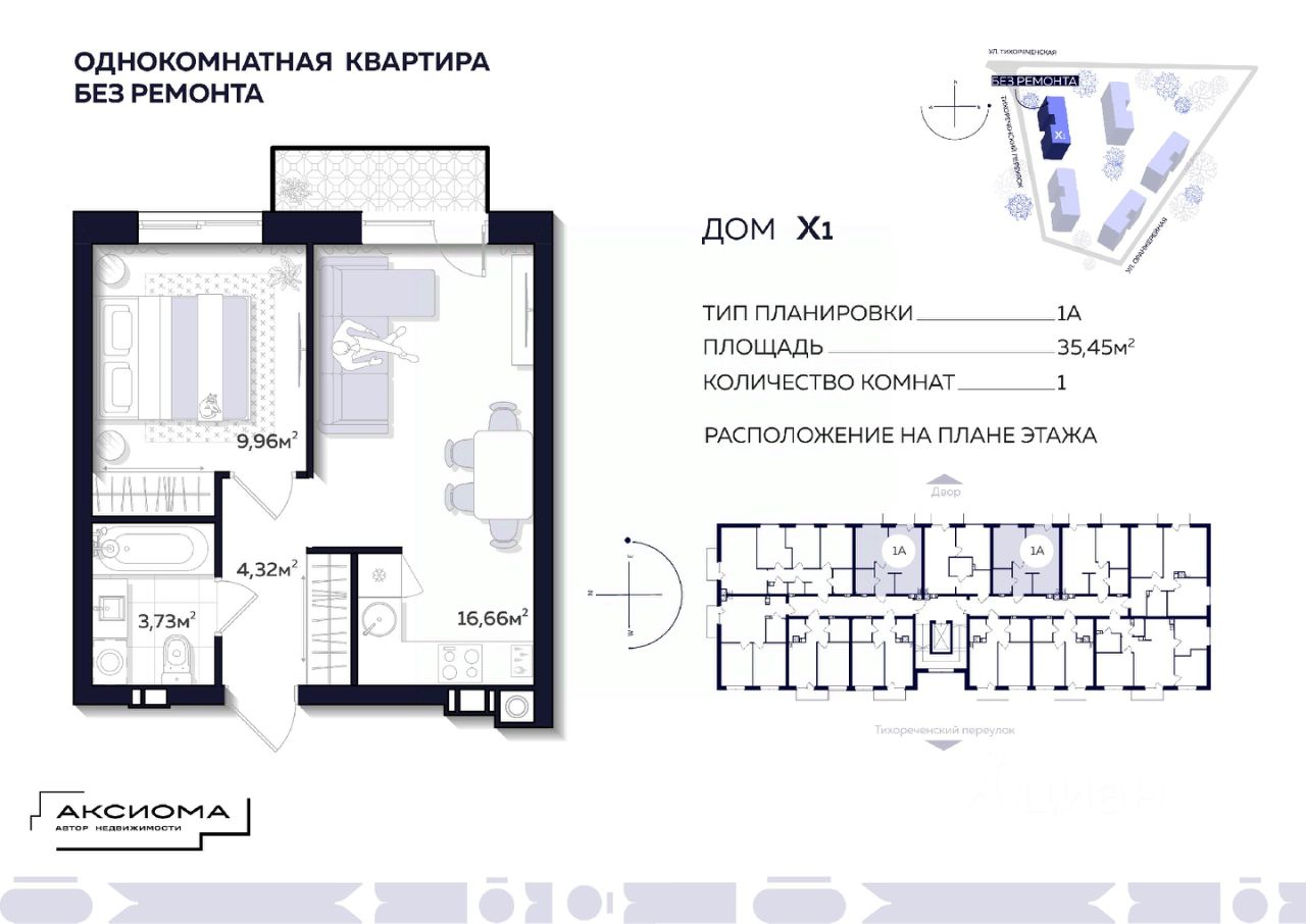 Продаётся 1-комнатная квартира в строящемся доме (Дом 1), срок сдачи: IV-кв. 2025, общей площадью 35.45 кв.м., на 2 этаже. Аксиома на Тихореченской