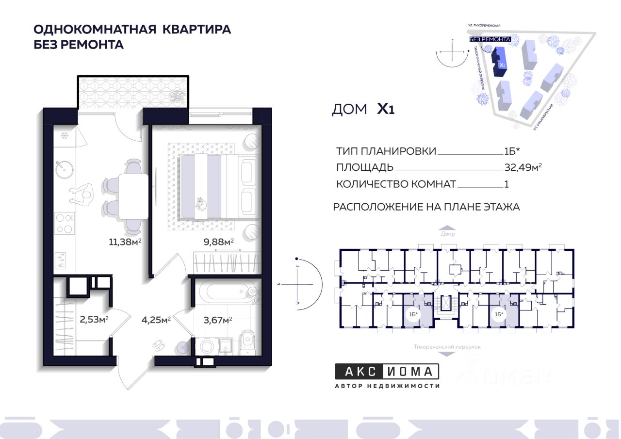 Продаётся 1-комнатная квартира в строящемся доме (Дом 1), срок сдачи: IV-кв. 2025, общей площадью 32.49 кв.м., на 2 этаже. Аксиома на Тихореченской