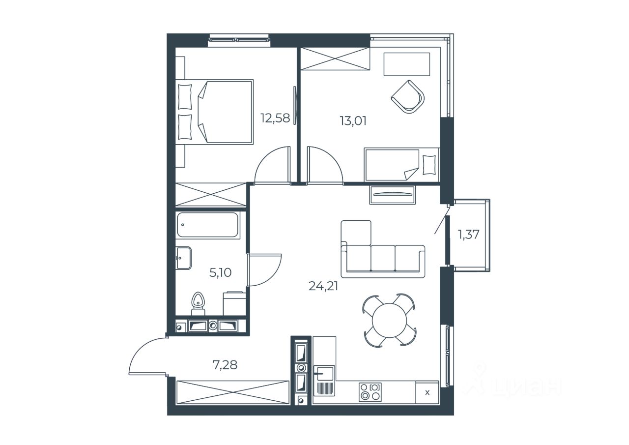 Продаётся 2-комнатная квартира в строящемся доме (Корпус 1), срок сдачи: II-кв. 2029, общей площадью 63.39 кв.м., на 19 этаже.