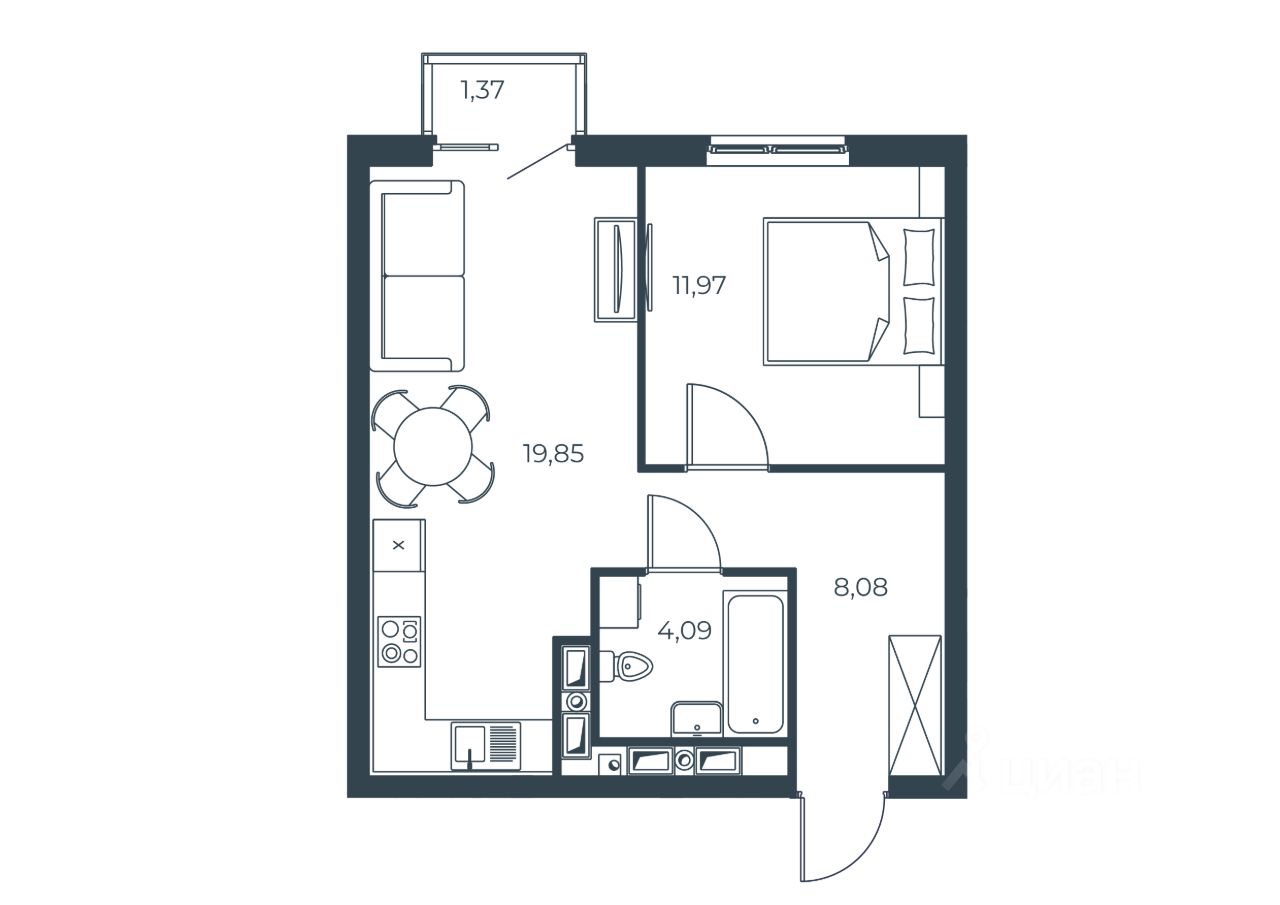 Продаётся 1-комнатная квартира в строящемся доме (Корпус 1), срок сдачи: II-кв. 2029, общей площадью 45.36 кв.м., на 25 этаже.