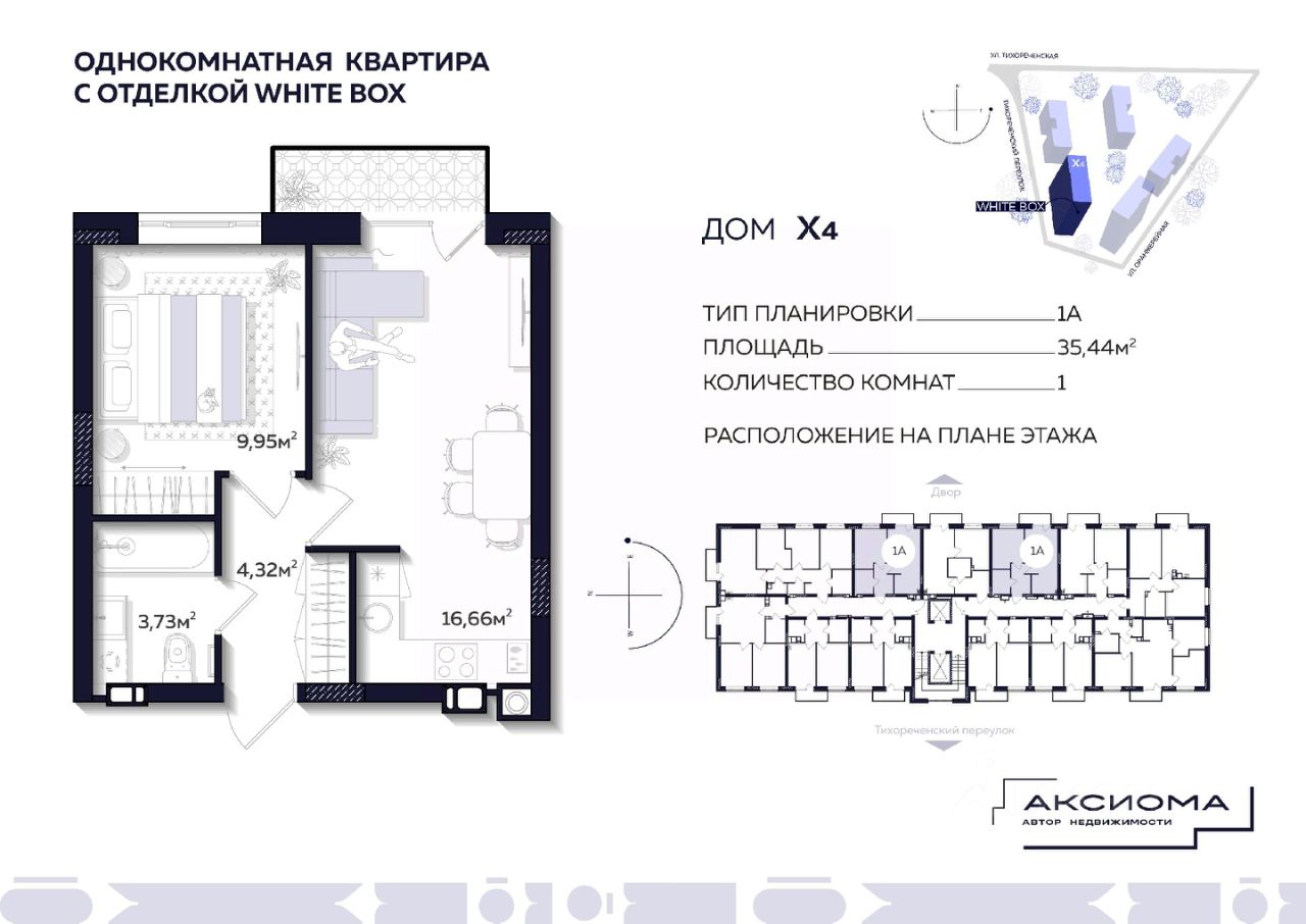 Продаётся 1-комнатная квартира в строящемся доме (Дом 4), срок сдачи: II-кв. 2027, общей площадью 35.44 кв.м., на 3 этаже. Аксиома на Тихореченской