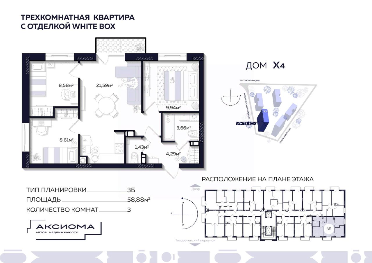 Продаётся 3-комнатная квартира в строящемся доме (Дом 4), срок сдачи: IV-кв. 2026, общей площадью 58.88 кв.м., на 3 этаже. Аксиома на Тихореченской