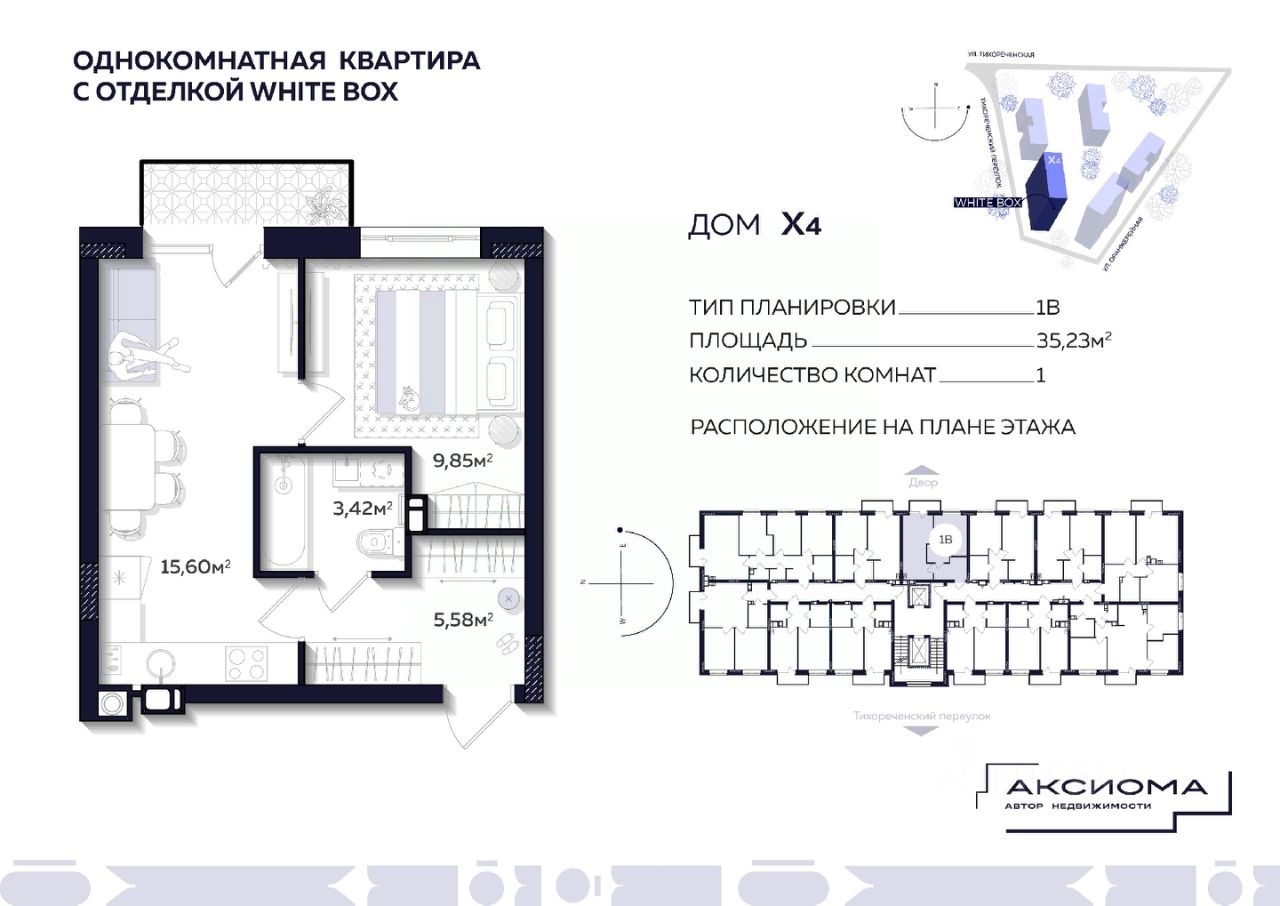 Продаётся 1-комнатная квартира в строящемся доме (Дом 4), срок сдачи: II-кв. 2027, общей площадью 35.23 кв.м., на 7 этаже. Аксиома на Тихореченской