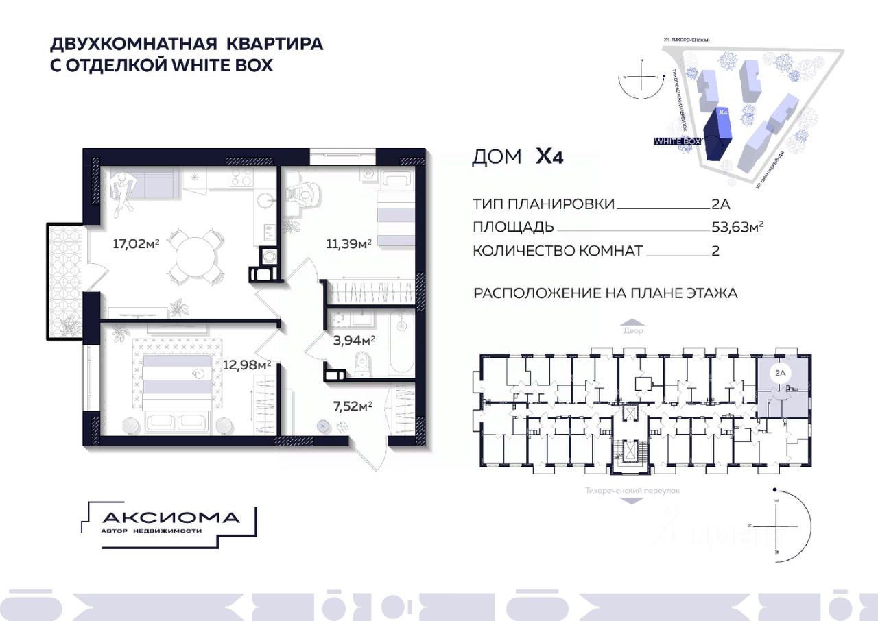 Продаётся 2-комнатная квартира в строящемся доме (Дом 4), срок сдачи: II-кв. 2027, общей площадью 53.63 кв.м., на 7 этаже. Аксиома на Тихореченской