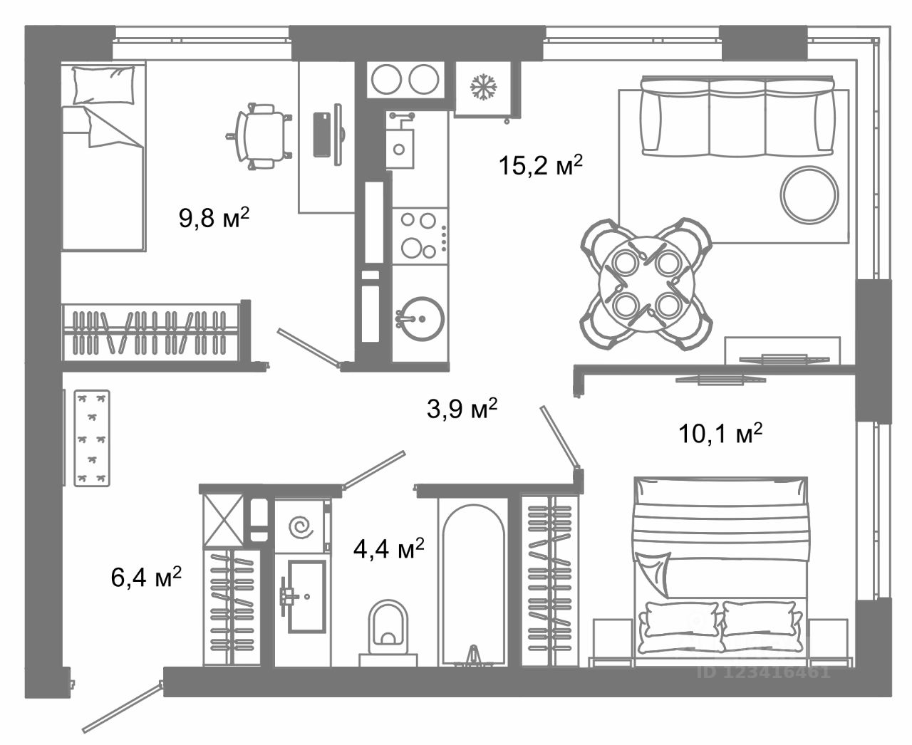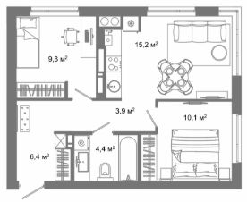 В проекте представлены 107 планировочных решений: от уютных студий 31,1 м² до квартир с тремя спальнями и кухней-гостиной 128 м² с функциональным разделением на гостевую и приватные зоны.