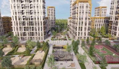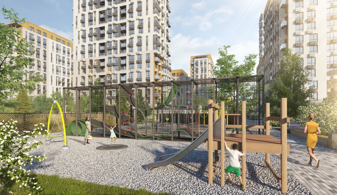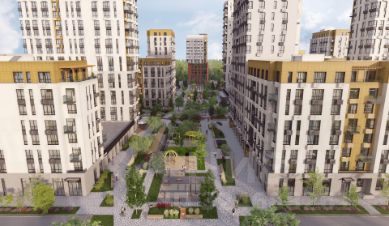 Общая площадь благоустройства проекта — 7 гектаров. Главная особенность проекта — переменная этажность домов от 8 до 25 этажей.