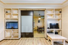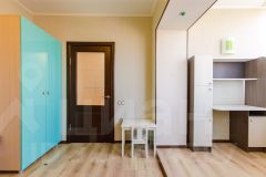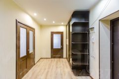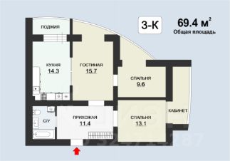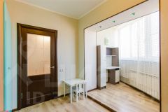 Планировка представляет собой просторную входную зону-прихожую 11.4 кв.м. со встроенной системой хранения, проходной зал-гостиная 15.7 кв.м. с распашными дверями-купе, которыми можно регулировать совместное пространство с кухней 14.3 кв.м. (с выходом на застекленную лоджию), детская спальная 9.6 кв.м. и родительская с выходом на дополнительную площадь, которая адаптирована под кабинетную зону.