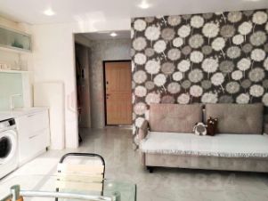 Только что сделан ремонт. Пол - крупная плитка под мрамор. По всей квартире потолок натяжной (h=2.85м) со светодиодными лампами.