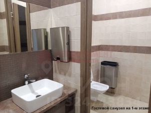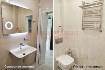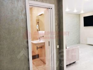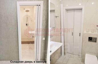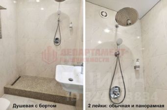 Ванная комната из холла через складную дверь. Просторно. Всё в плитке. Душевой поддон с направленным сливом. Бортик по щиколотку. Две лейки душа: обычная и панорамная. Над раковиной сенсорное зеркало с подсветкой. Унитаз - инсталяция. Сантехника фирмы "ROCA".