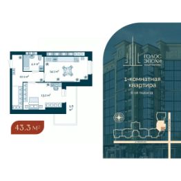 Продаётся 1-комнатная квартира в строящемся доме (Дом 1), срок сдачи: IV-кв. 2025, общей площадью 43.3 кв.м., на 8 этаже. Жилой комплекс "Голос Эпохи" возводится в центральной части города Астрахань. Представляет собой девяти этажное кирпично-монолитное здание на 192 квартиры и 16 офисных помещений, выполненное в стиле АР-ДЕКО.