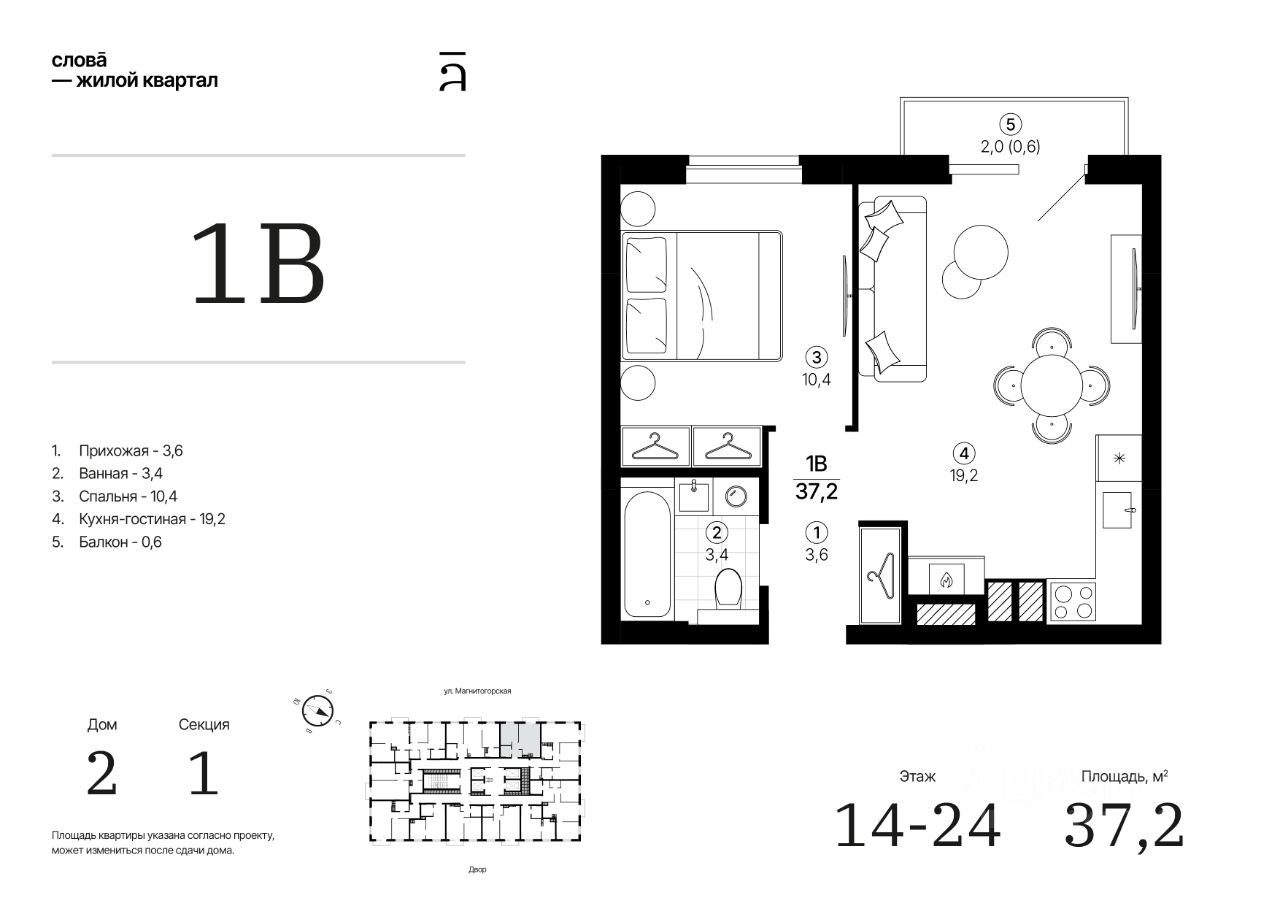 Продаётся 1-комнатная квартира в строящемся доме (Дом 2 секция 1), срок сдачи: IV-кв. 2028, общей площадью 37.15 кв.м., на 20 этаже. Жилой квартал "Слова" — это новые смыслы.