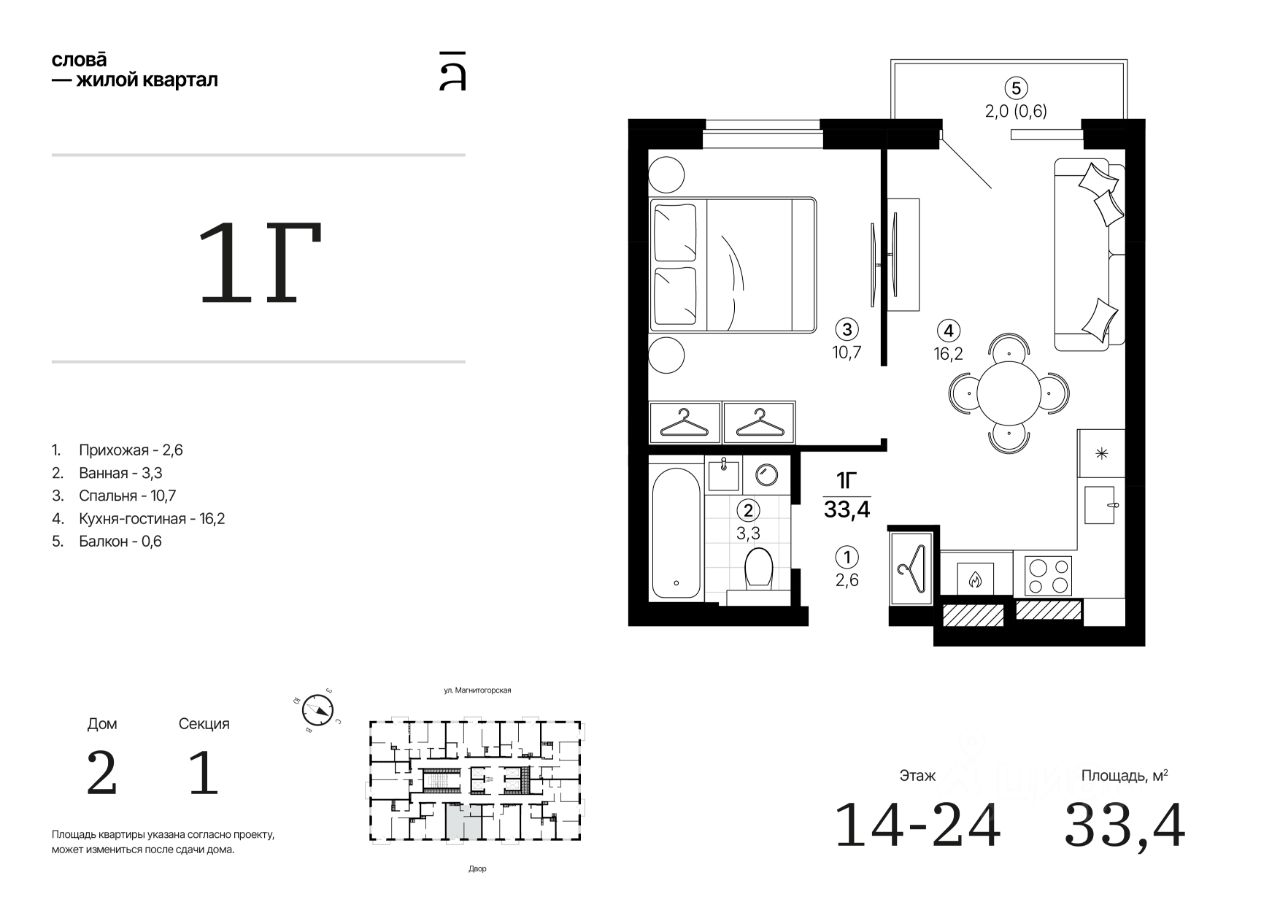 Продаётся 1-комнатная квартира в строящемся доме (Дом 2 секция 1), срок сдачи: IV-кв. 2028, общей площадью 33.42 кв.м., на 24 этаже. Жилой квартал "Слова" — это новые смыслы.