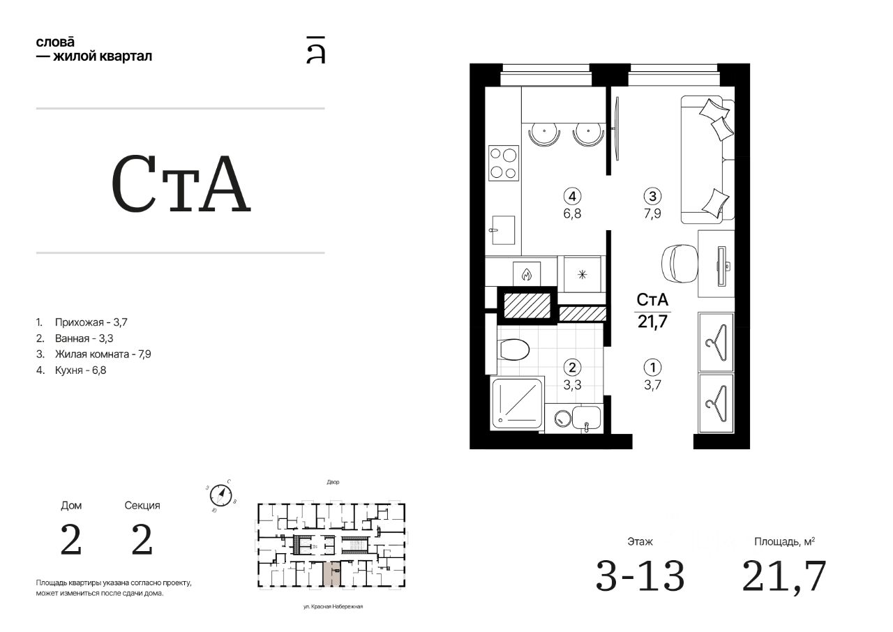 Продаётся студия в строящемся доме (Дом 2 секция 2), срок сдачи: IV-кв. 2028, общей площадью 21.69 кв.м., на 8 этаже. Жилой квартал "Слова" — это новые смыслы.