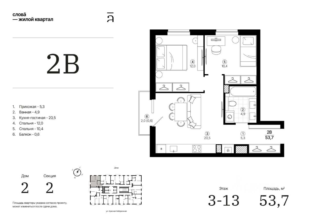 Продаётся 2-комнатная квартира в строящемся доме (Дом 2 секция 2), срок сдачи: IV-кв. 2028, общей площадью 53.68 кв.м., на 9 этаже. Жилой квартал "Слова" — это новые смыслы.