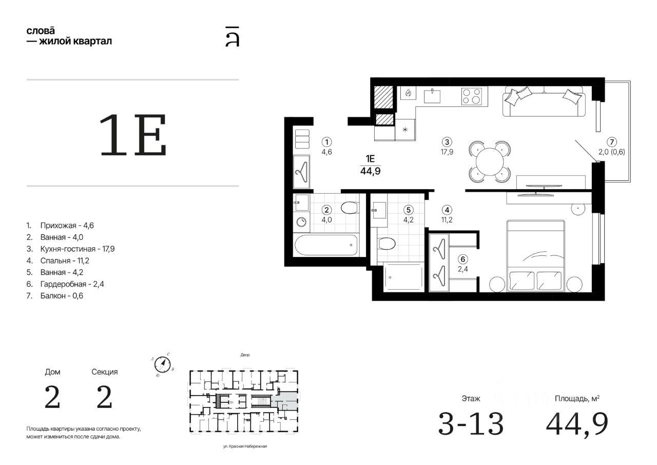 Продаётся 1-комнатная квартира в строящемся доме (Дом 2 секция 2), срок сдачи: IV-кв. 2028, общей площадью 44.91 кв.м., на 10 этаже. Жилой квартал "Слова" — это новые смыслы.