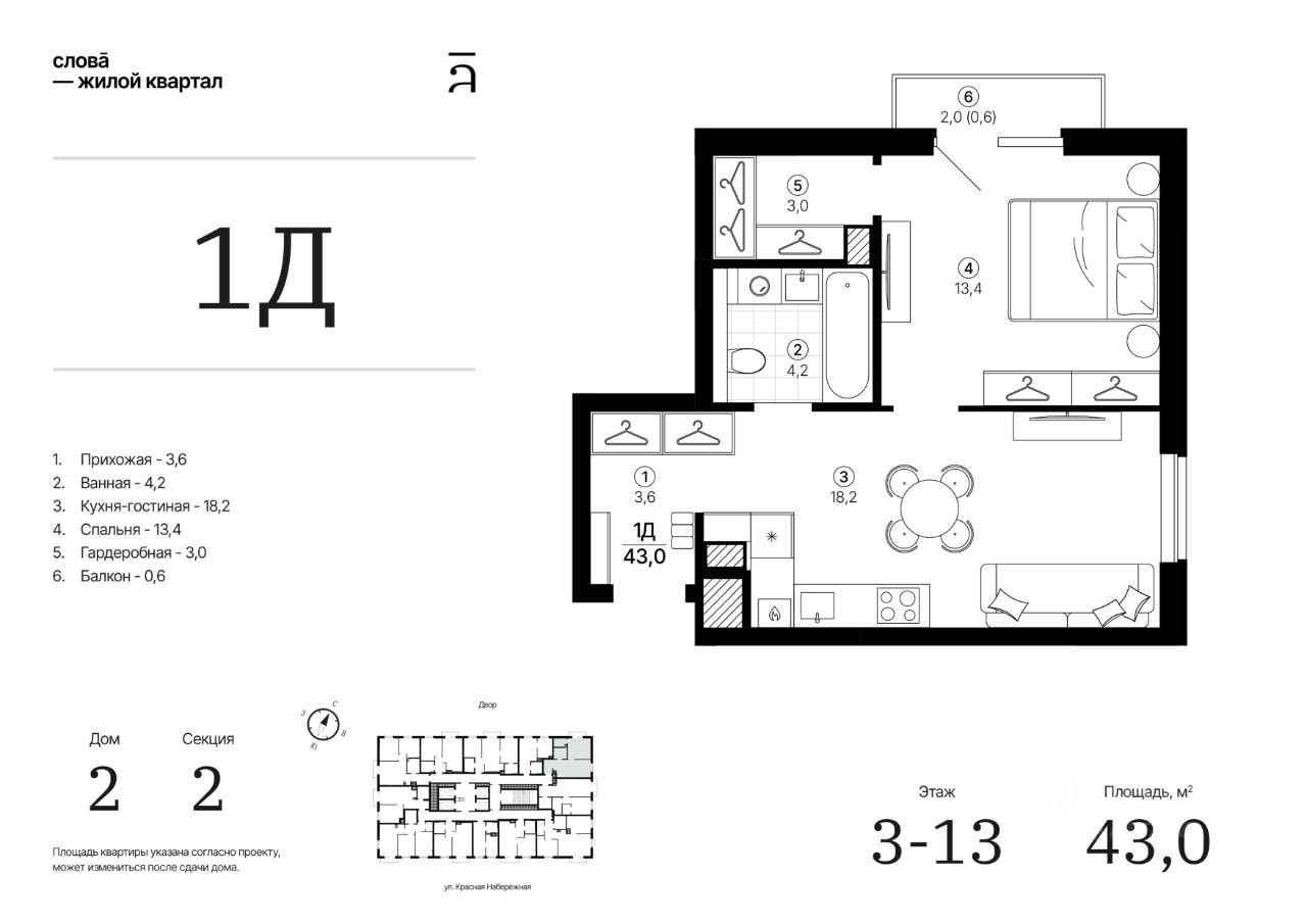 Продаётся 1-комнатная квартира в строящемся доме (Дом 2 секция 2), срок сдачи: IV-кв. 2028, общей площадью 43.02 кв.м., на 12 этаже. Жилой квартал "Слова" — это новые смыслы.