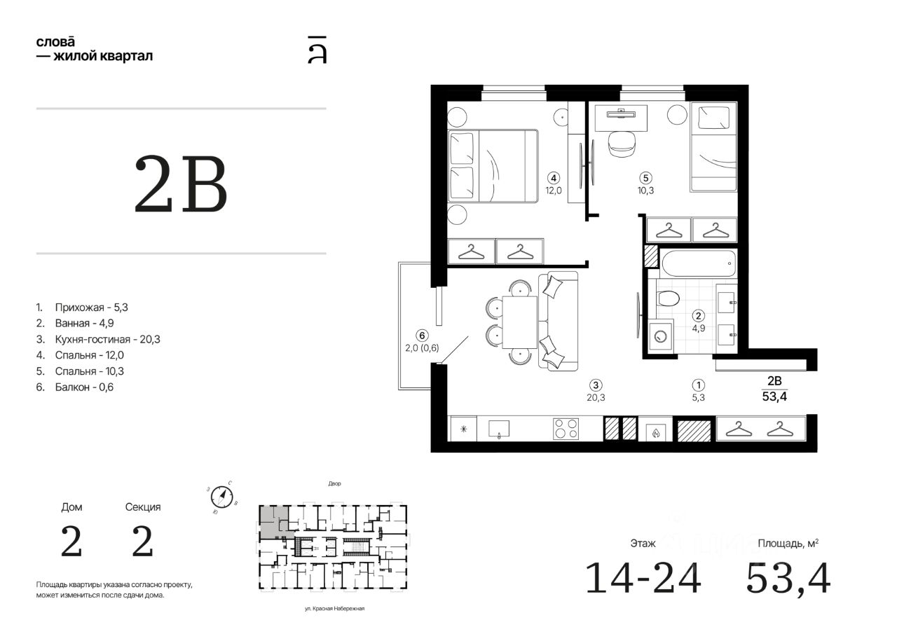 Продаётся 2-комнатная квартира в строящемся доме (Дом 2 секция 2), срок сдачи: IV-кв. 2028, общей площадью 53.44 кв.м., на 15 этаже. Жилой квартал "Слова" — это новые смыслы.