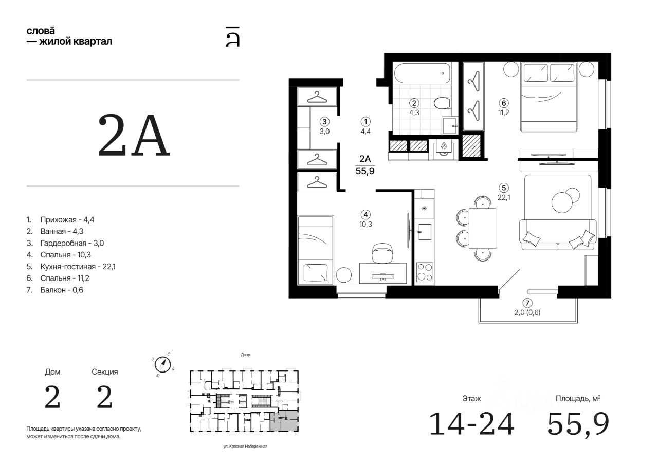 Продаётся 2-комнатная квартира в строящемся доме (Дом 2 секция 2), срок сдачи: IV-кв. 2028, общей площадью 55.88 кв.м., на 21 этаже. Жилой квартал "Слова" — это новые смыслы.