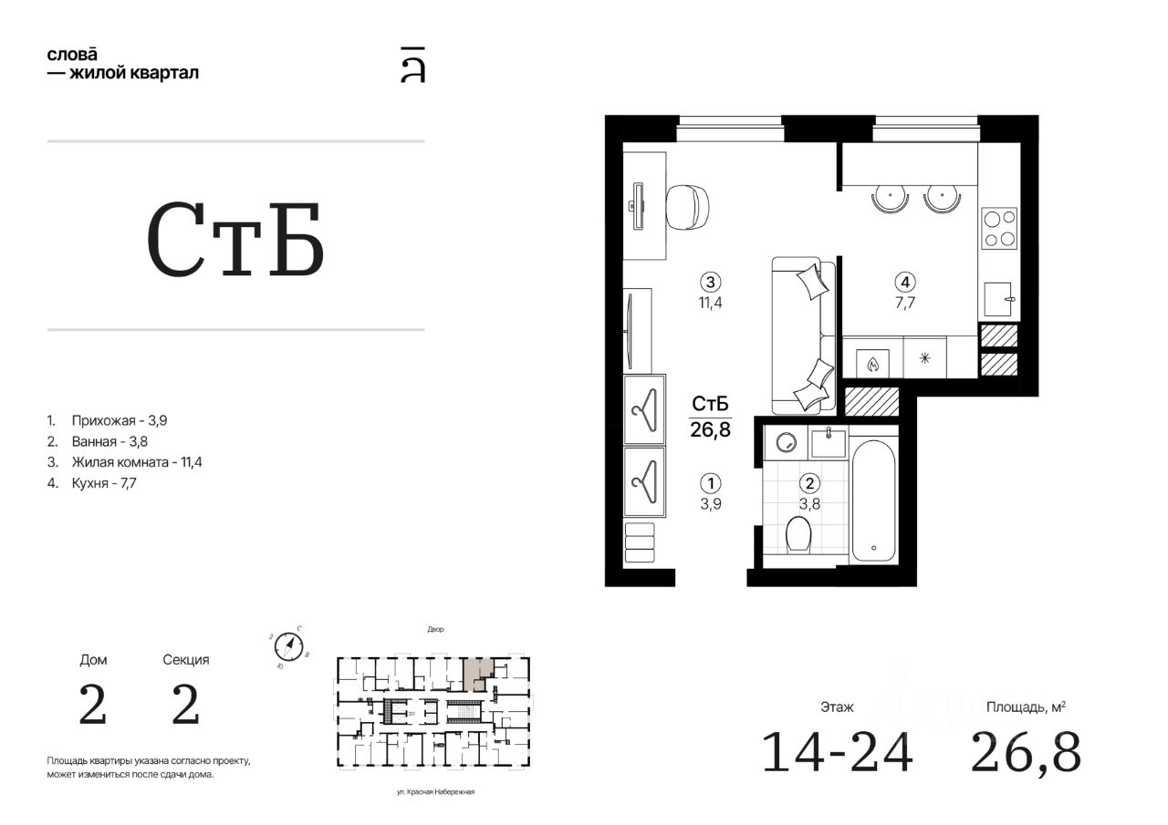 Продаётся студия в строящемся доме (Дом 2 секция 2), срок сдачи: IV-кв. 2028, общей площадью 26.8 кв.м., на 24 этаже. Жилой квартал "Слова" — это новые смыслы.