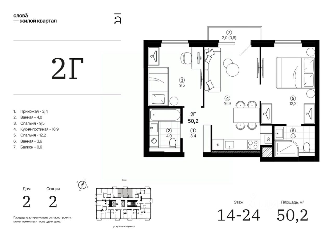 Продаётся 2-комнатная квартира в строящемся доме (Дом 2 (секции 1, 2)), срок сдачи: IV-кв. 2028, общей площадью 50.15 кв.м., на 20 этаже. Жилой квартал "Слова" — это новые смыслы.