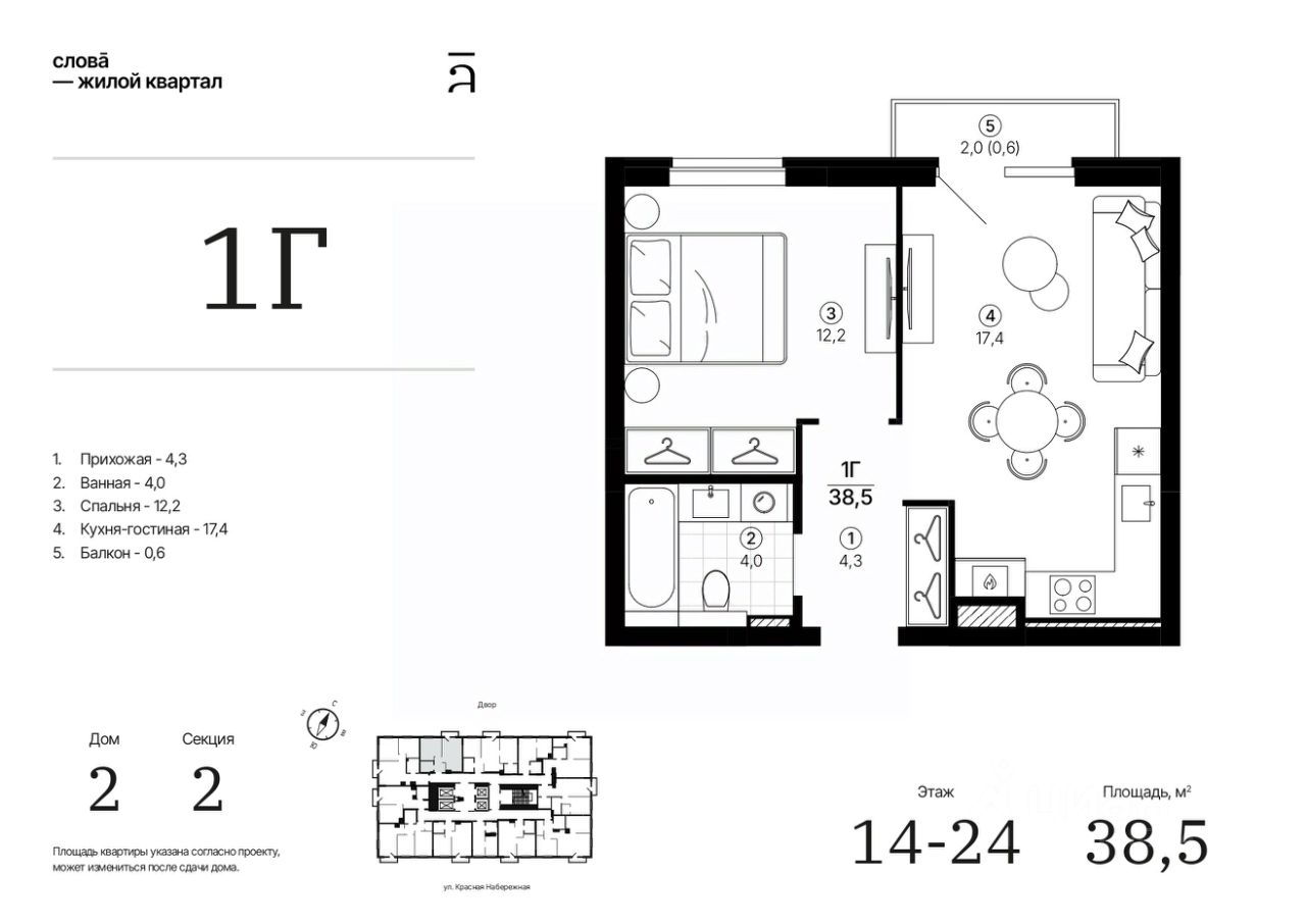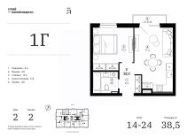 Продаётся 1-комнатная квартира в строящемся доме (Дом 2 (секции 1, 2)), срок сдачи: IV-кв. 2028, общей площадью 38.48 кв.м., на 23 этаже. Жилой квартал "Слова" — это новые смыслы.