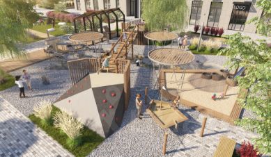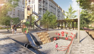 - 24 тематические зоны на бульваре: пространства для отдыха и релакса с гамаками и шезлонгами, центральная площадь с амфитеатром и контактным фонтаном, 2 зоны work-out, детские игровые площадки, разделенные по возрастам, тарзанка, водные и скалолазные конструкции, песочницы, батуты;