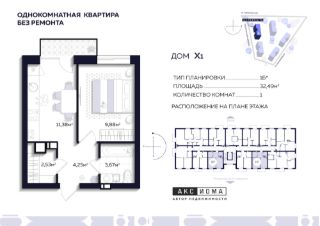 Продаётся 1-комнатная квартира в строящемся доме (Дом 1), срок сдачи: I-кв. 2026, общей площадью 32.49 кв.м., на 2 этаже. Аксиома на Тихореченской