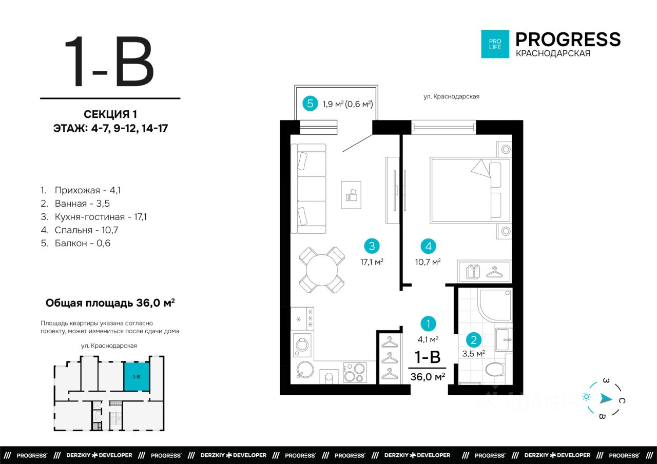 Продаётся 1-комнатная квартира в строящемся доме (Дом 1), срок сдачи: I-кв. 2028, общей площадью 35.96 кв.м., на 4 этаже. Новый жилой комплекс "Точка" от застройщика "Будущее" расположен по адресу: г. Астрахань, ул. Краснодарской, 43а