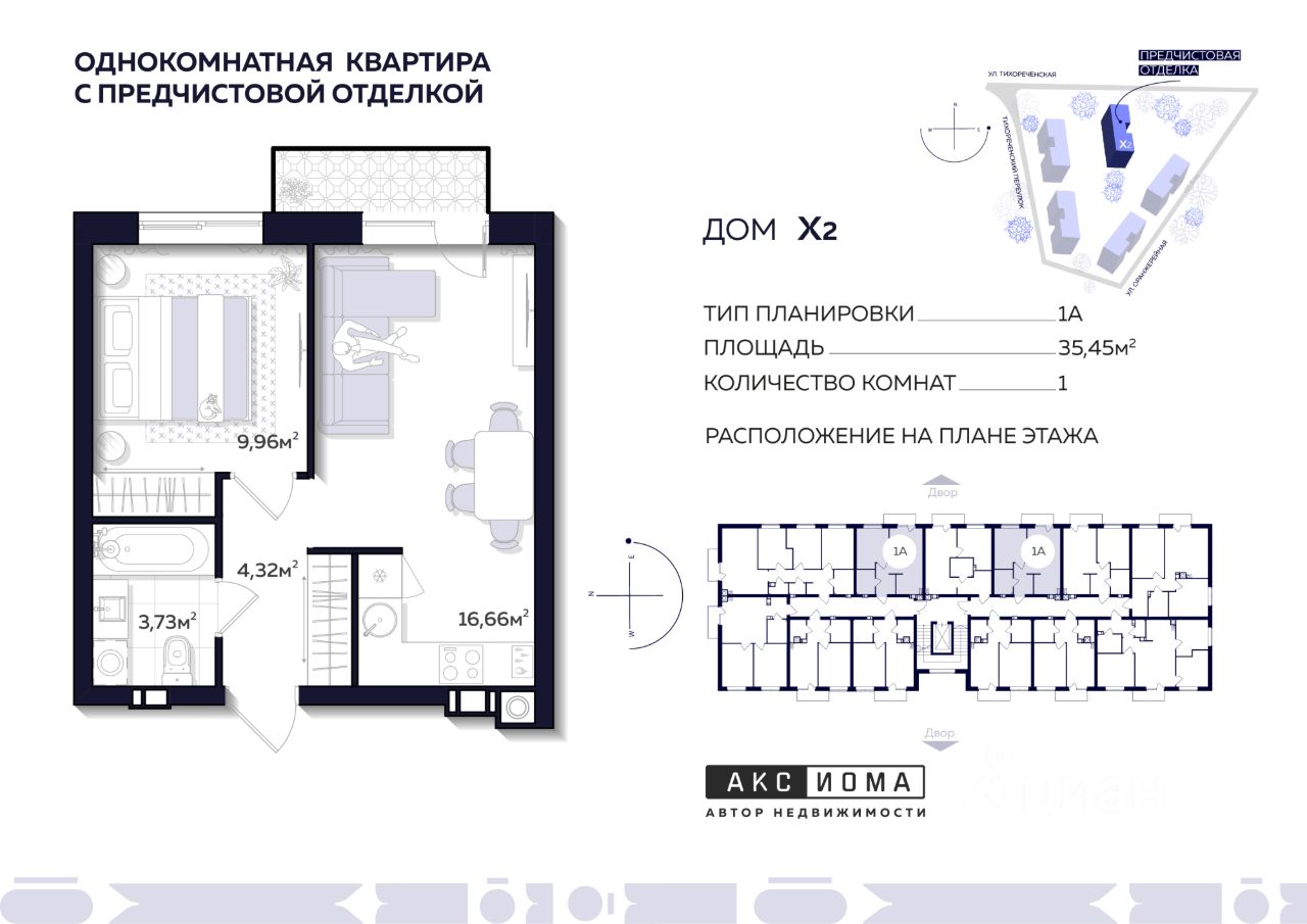 Продаётся 1-комнатная квартира в строящемся доме (Дом 2), срок сдачи: I-кв. 2026, общей площадью 35.45 кв.м., на 5 этаже. Аксиома на Тихореченской