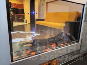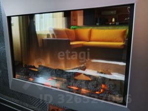 В гостиной зоне декоративный электрокамин в окружении мягкой мебели с выходом на закрытую лоджию.