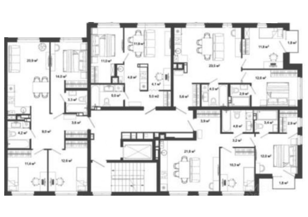 В проекте представлены 107 планировочных решений: от уютных студий 31,1 м² до квартир с тремя спальнями и кухней-гостиной 128 м² с функциональным разделением на гостевую и приватные зоны.