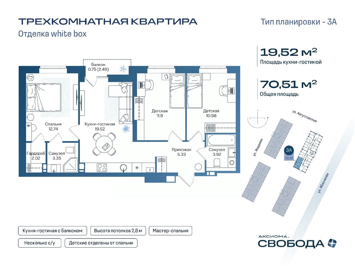 Квартира с продуманными коммуникациями и комфортной отделкой. Установлен газовый котёл с радиаторами, в санузле и зоне у входа — тёплый пол. Выполнена скрытая электропроводка с розетками и выключателями. Проведены системы холодного и горячего водоснабжения и канализации. ПВХ-окна с хорошей тепло- и шумоизоляцией. Надёжные межквартирные стены из газобетона 250 мм обеспечивают вам тишину и комфорт. "Аксиома.Свобода плюс" — новый дом комфорт-класса на ул. Августовская, 70 (Астрахань) 17-этажный монолитный дом с современной архитектурой (неоклассика + хай-тек) в живописном районе рядом с рекой и всей городской инфраструктурой. Отличная локация: Супермаркет — 2 минуты, школы и детские сады, ТЦ, медицинские и спортивные учреждения, техникумы и университеты. Остановка общественного транспорта — через дорогу. Удобный выезд на основные магистрали. Закрытая территория без транзитного трафика: Детские и спортивные площадки, прогулочные зоны, озеленение, круглосуточное видеонаблюдение. Дизайнерское лобби с потолками более 3 м, колясочная и велосипедная, современные инженерные решения. Квартиры с продуманными планировками: Потолки 2,8 м, большие окна и панорамные балконы, функциональные кухни и спальни. Парковка под видеонаблюдением. Комфорт-класс с ощущением премиальности и приватности. Позвоните сейчас и забронируйте квартиру по самой выгодной цене!