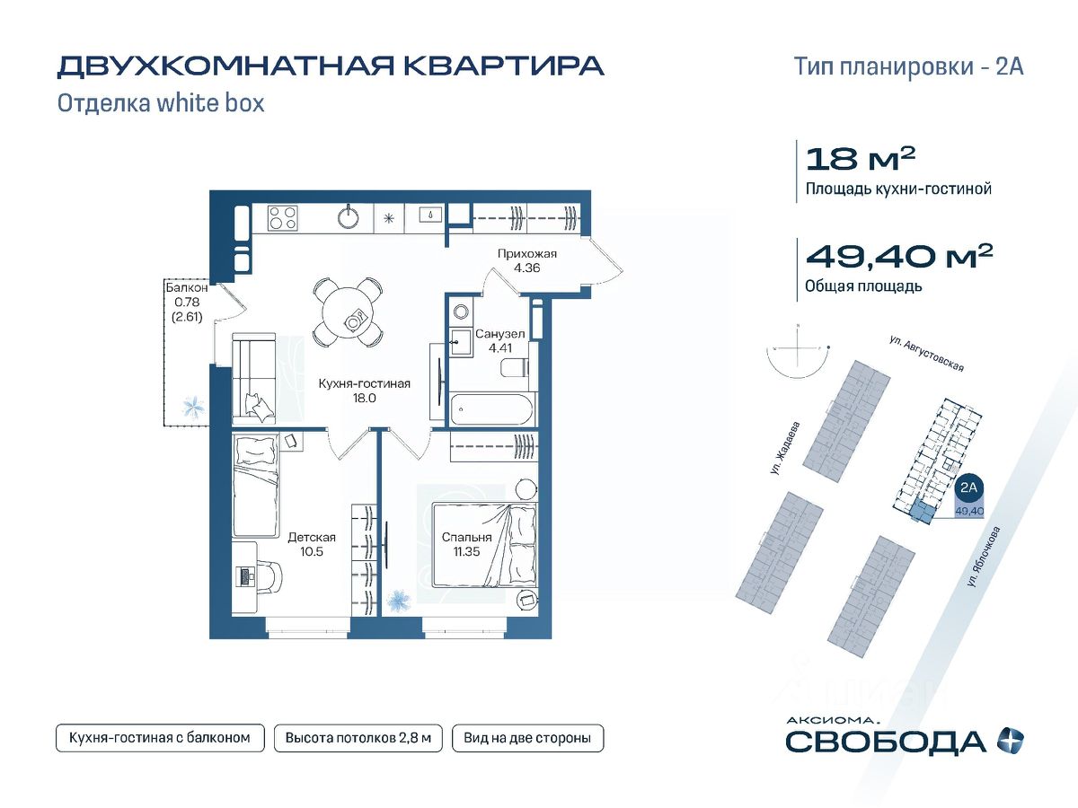 Потолки 2,8 м, большие окна и панорамные балконы, функциональные кухни и спальни.