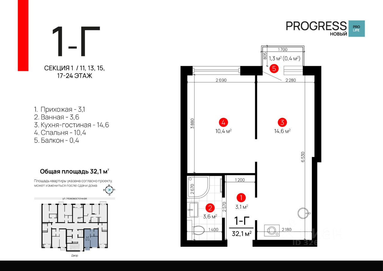 Общая площадь32,07 м²