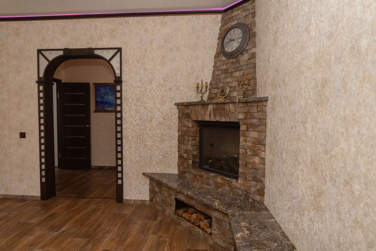 В гостиной декоративная каминная зона с функцией обогрева - создаёт атмосферу уюта и дополнительный источник тепла.