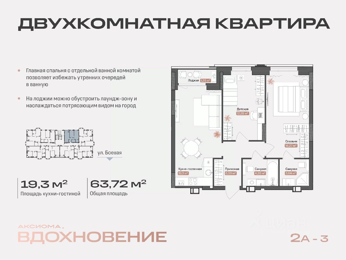 Продаётся 2-комнатная квартира в строящемся доме (Дом 50А), срок сдачи: IV-кв. 2027, общей площадью 63.72 кв.м., на 7 этаже. Новый жилой комплекс "Аксиома.Вдохновение" от застройщика "Аксиома" расположен по адресу: Астрахань, ул., Боевая, 50А