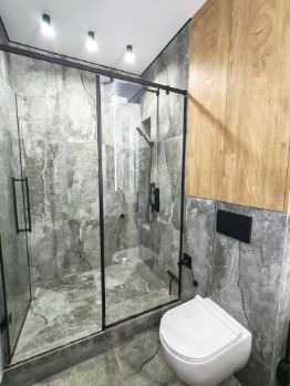 3. Продуманная планировка S=42 кв.м (с учетом всех помещений) с панорамными окнами. Кухня-гостинная 18 м2, просторная прихожая с встроенной системой хранения, спальная комната с вместительным шкафом и туалетным столиком для прекрасной дамы. Полностью оборудованная душевая комната (в этой зоне полы с подогревом), инсталляция, стиральная машина c сушилкой (Вeko), керамогранит, столешница из камня.