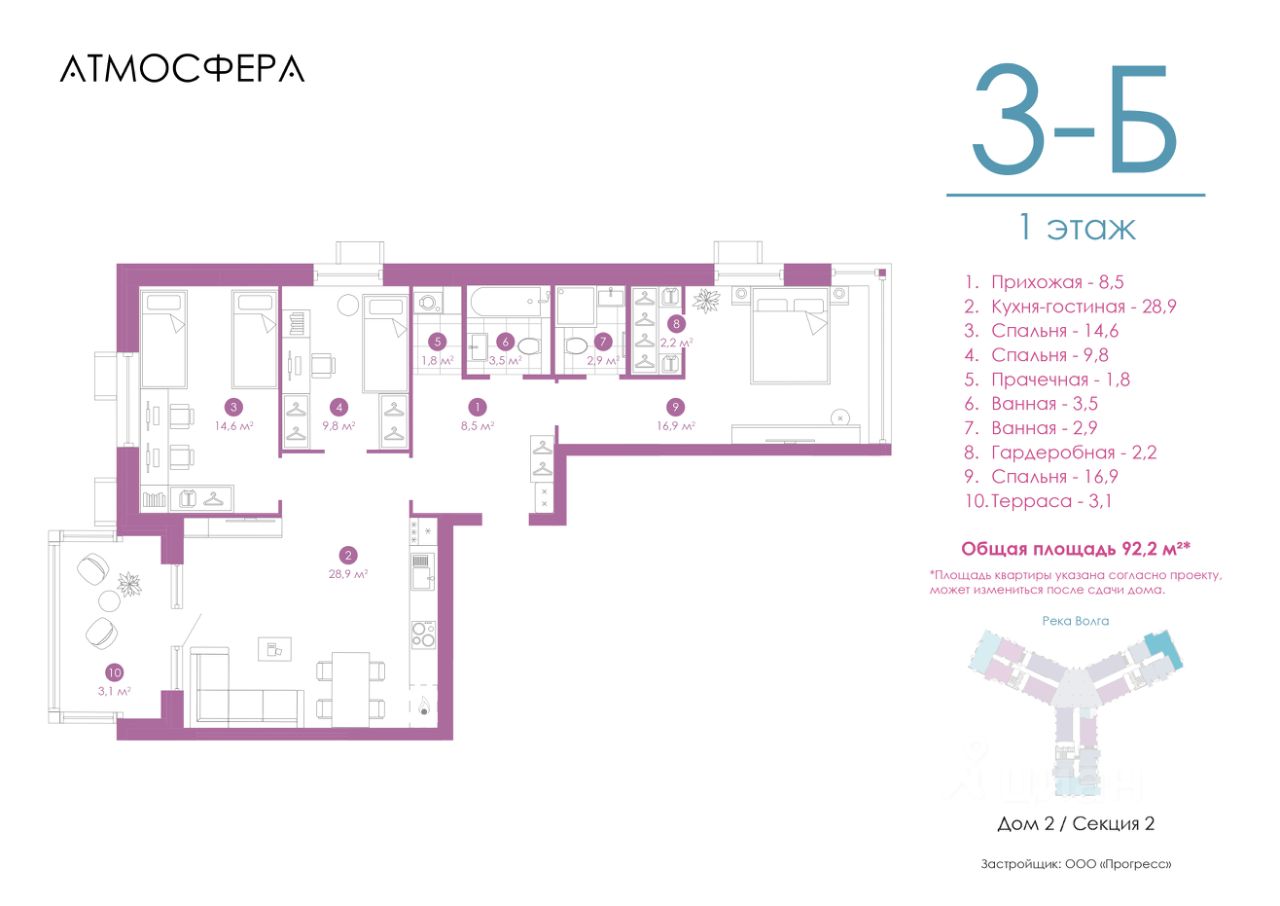Продажа от застройщика PROGRESS — дерзкий девелопер федерального уровня, одна из самых быстроразвивающихся компаний на российском рынке. Предвосхищает ваши ожидания с 2012 года. Каждый проект PROGRESS оригинален, отличается дизайном, архитектурой и ландшафтными решениями. Является обладателем Золотого знака "Надёжный застройщик России — 20202023". Комплекс обслуживает собственная сервисная компания "Среда". Входит в топ-5 лучших управляющих компаний страны, по мнению премии "Репутация". Живи в Атмосфере Жилой комплекс "Атмосфера" — уникальный проект линейки PRO MAX. Многоуровневая закрытая дворовая территория, авторская концепция холлов, сервис на уровне пятизвёздочного отеля. Уединённая локация между двумя водными пространствами — рекой Волгой и Приволжским затоном. На безопасной приватной дворовой территории ведётся круглосуточное видеонаблюдение. Для самых маленьких здесь оборудован детский игровой центр — кидс клаб, а для взрослых — премиальная кофейня с чарующим видом на Волгу. "Атмосфера" выводит понятие "комфорт" на совершенно иной уровень. Каждая деталь говорит о стремлении к совершенству. "Атмосфера" в цифрах: 4 дома с собственной уникальной и интерактивной дворовой территорией прямо на берегу реки Волги 1 приватный двор размером с городской парк 7 спортивных площадок 6 пространств для отдыха 5 детских площадок, включающих в себя интерактивный ручеёк и автодром 10 минут от исторической части города Почувствуй роскошный сервис • Собственная сервисная компания "Среда" поможет не беспокоиться о бытовых проблемах. • Персональное мобильное приложение "Среда", в котором можно просматривать новости и объявления, оплачивать коммунальные счета, получить доступ во двор и к камерам видеонаблюдения. • Консьерж-сервис. • Бесплатный wi-fi на всей территории комплекса. Квартира с предчистовой отделкой включает в себя: — Межквартирные стены, выровненные по маякам. — Межкомнатные стены из гипсовых пазогребневых плит, не требующие дополнительного выравнивания. — Откосы входной двери и оконных проёмов, реализованные и подготовленные к финишной отделке. — Напольное покрытие без стяжки. — Электрическая проводка по потолку. — Подводка инженерных коммуникаций к местам установки сантехнических приборов. Способы приобретения квартиры: С помощью материнского капитала В ипотеку Забронируйте квартиру по номеру телефона офиса продаж. Выведи свою жизнь на новый уровень. Живи в Атмосфере.