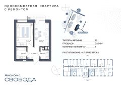 Продаётся 1-комнатная квартира в строящемся доме (Дом 3), срок сдачи: IV-кв. 2026, общей площадью 32.07 кв.м., на 5 этаже. Свобода духа, свобода выбора, свобода творчества! Место, где вы точно станете автором своей жизни!